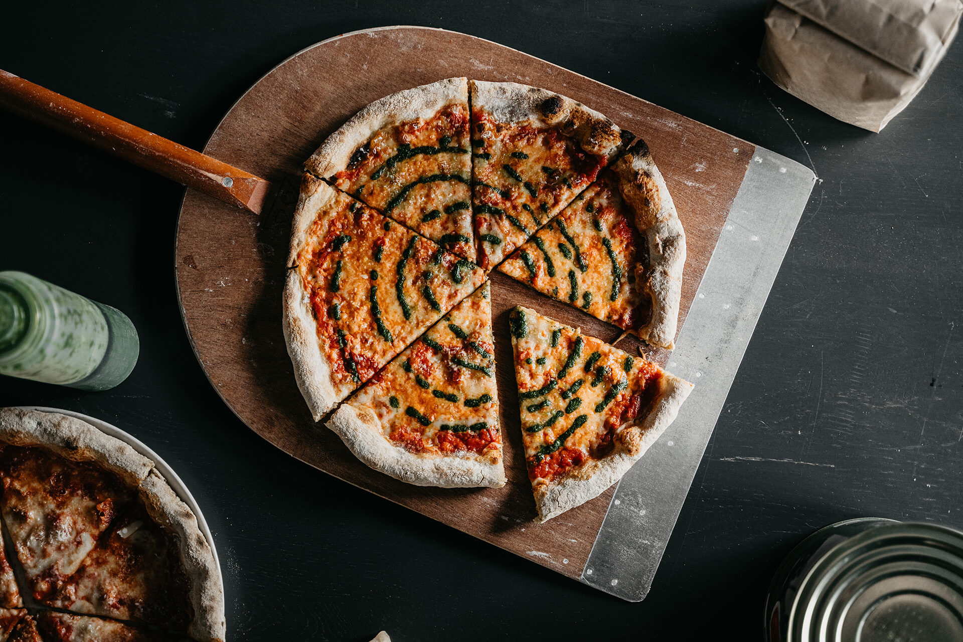 Alla pizzor går att få med botten utan tillsat gluten , dock bakade i miljö där det finns mjöl.